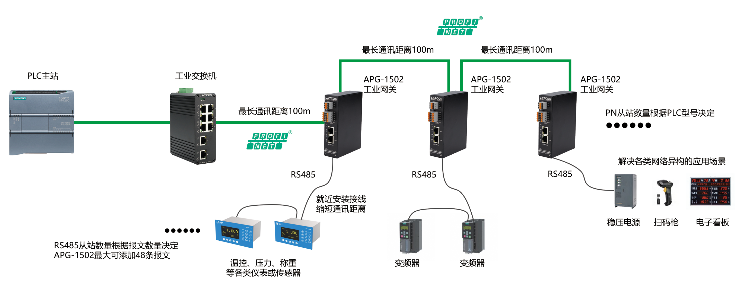 凌科自動化出品的系列工業網關產品,是一種實現工業通訊協議的轉換模塊。將不同的工業協議轉為標準的Modbus RTU,用來解決工業現場多總線網絡的的異構互聯問題,其中APG-1502應用最為廣泛,常用于實現變頻器、溫控表、I/O、掃描器等設備與西門子PLC之間實現高效的數據交換,不需要復雜的編程,快速組網,便捷的數據映射,是一款高性能的工業級網關產品。