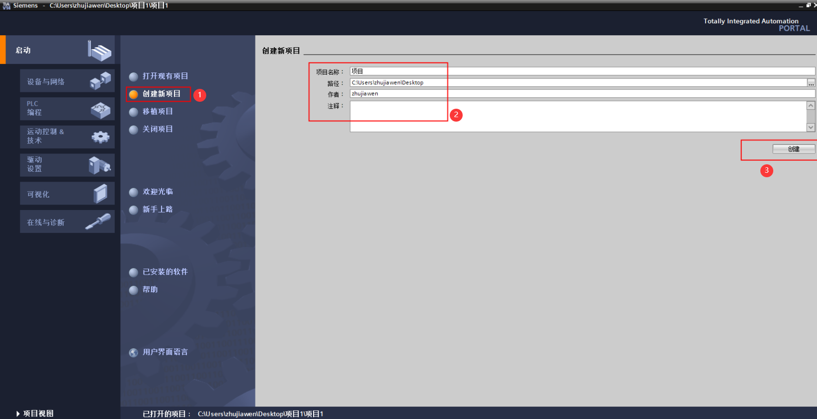 新建工程打開 TIA Portal 軟件,選擇“創建新項目”,并填寫項目名稱、路徑、版本、作者等相關信息,點擊創建: