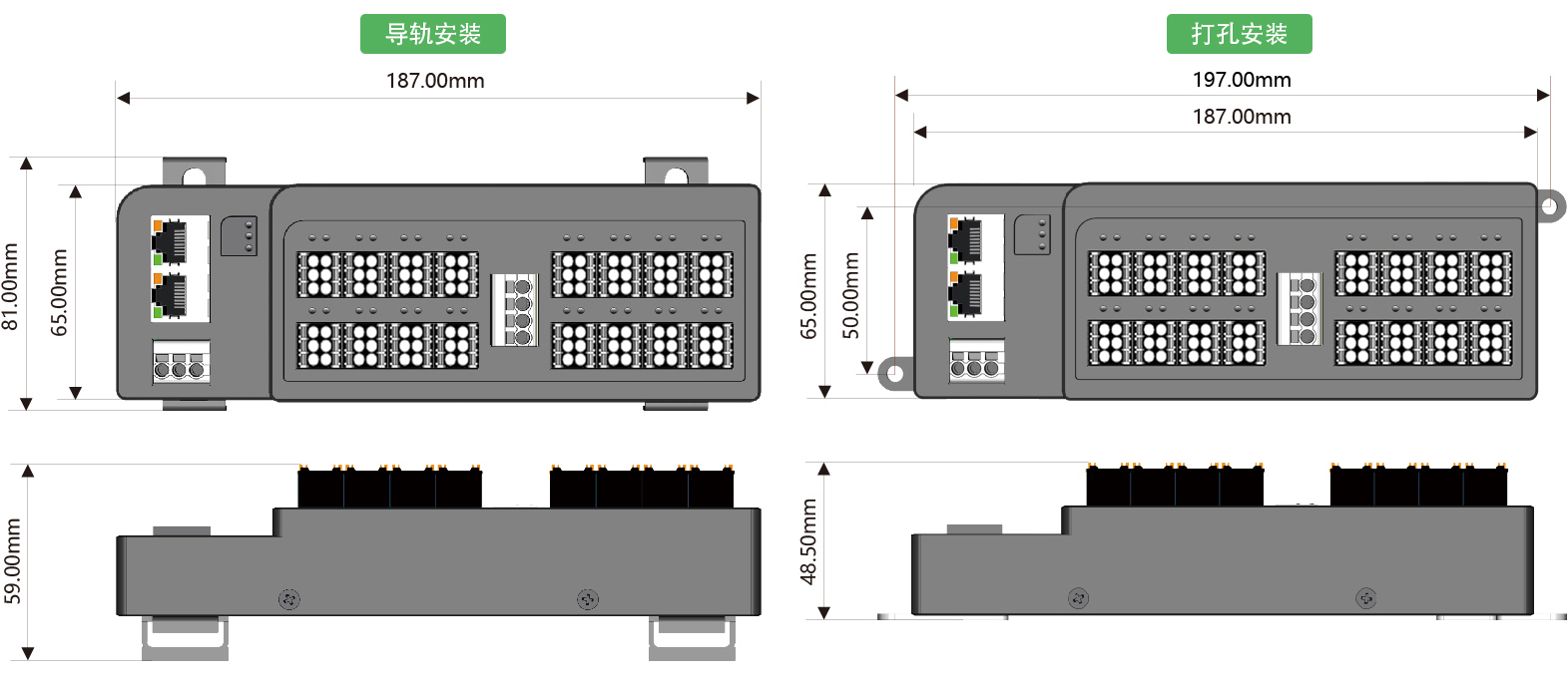 安裝方式:DIN35導軌安裝或雙側耳打孔安裝