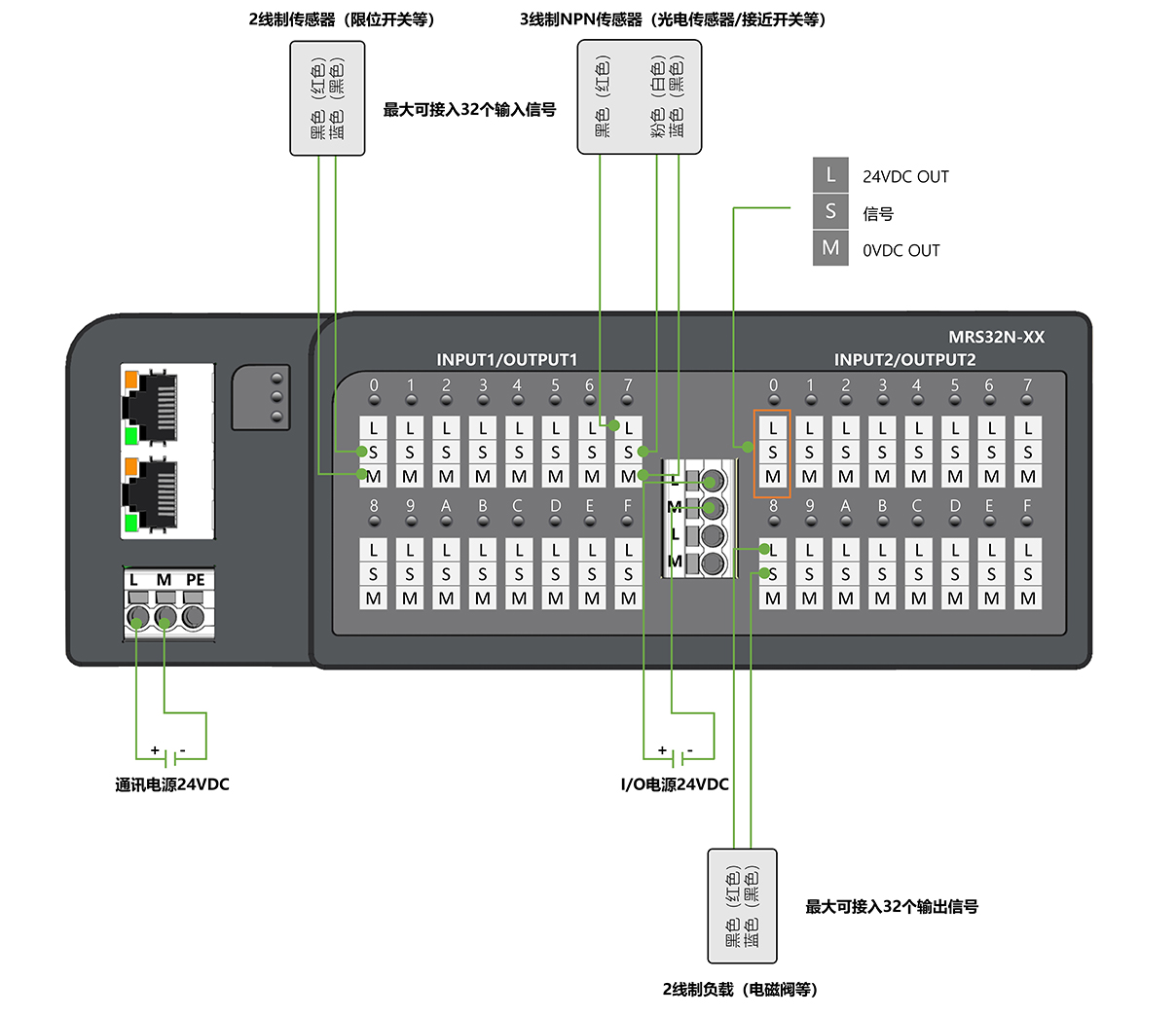 面板式快接線分布式I/O,PROFINET通訊,2xRJ45,可級聯;NPN,32xDI/DO自適應,24VDC,單通道最大輸出0.5A,歐式彈簧端子;導軌安裝&打孔安裝(下單時需備注)